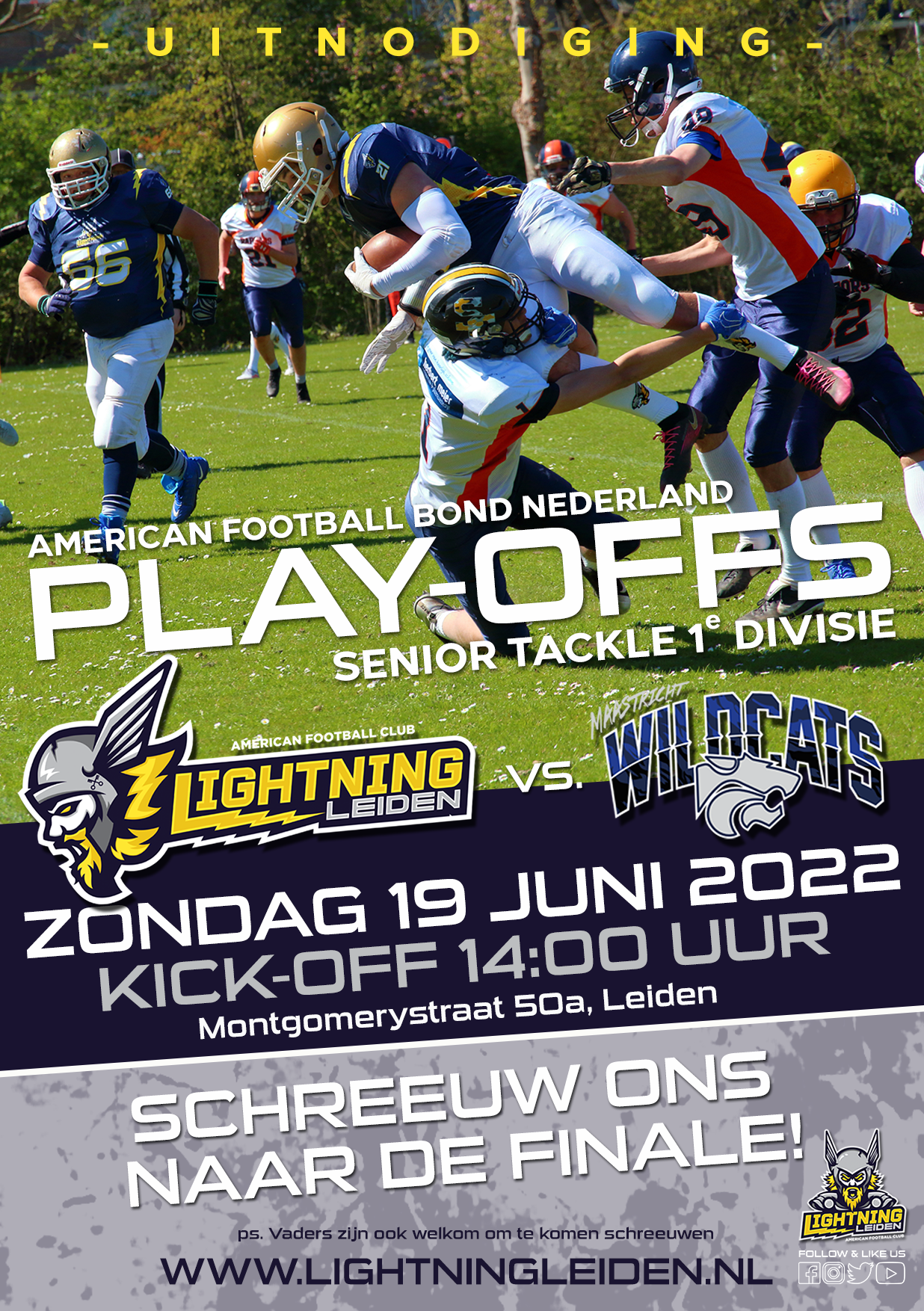 De dag dat Lightning Leiden met 1 been in de finale staat. De dag van de play-offs wedstrijd van de senioren tegen Maastricht Wildcats. En de dag dat we iedereen oproepen om onze senioren naar de finale in Amsterdam te schreeuwen!